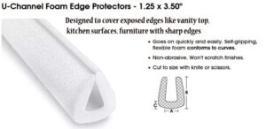 Generic corner bumper. Fits most vanities and counter tops. It integrates well with our standard v-shaped edge protectors. Cut to size with scissors or utility knife. Requires glue for secure placement.